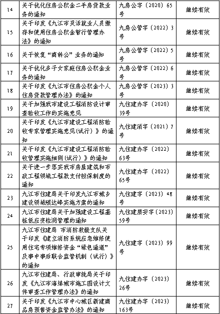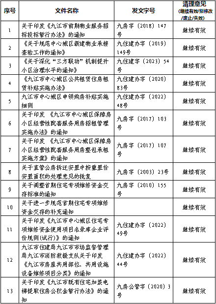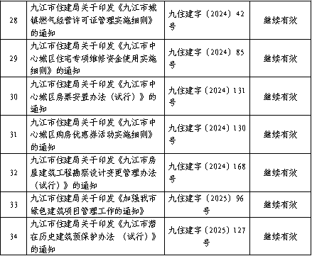 1.《九江市前期物业服务招标投标暂行办法》等34文件(见附件1)继续有效;