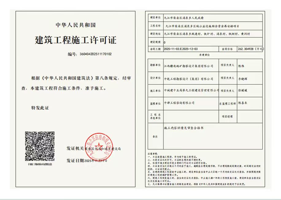 核发九江市柴桑区涌泉乡区域公益设施结余资金再安排项目建筑工程施工许可证