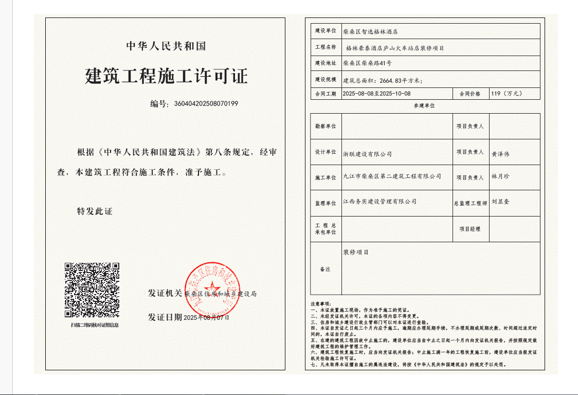 核发格林豪泰酒店庐山火车站店装修项目施工许可证