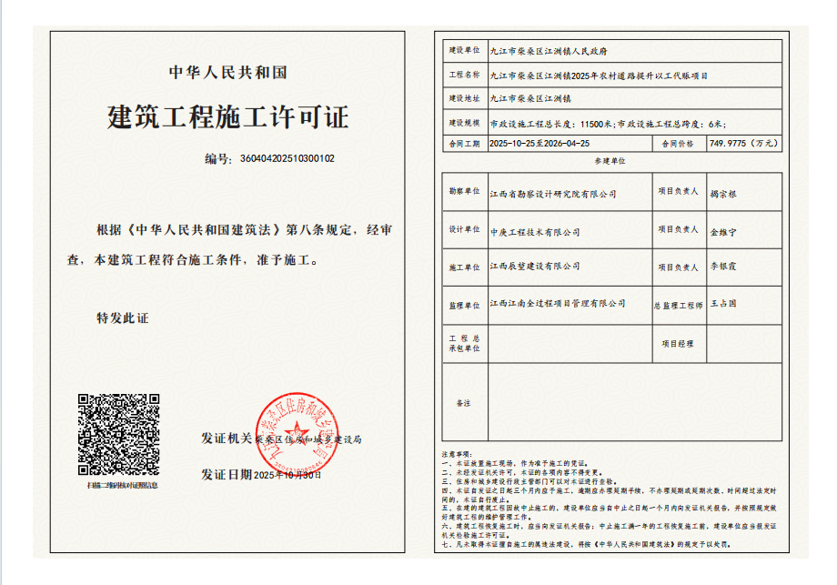 核发九江市柴桑区江洲镇2025年农村道路提升以工代赈项目施工许可证