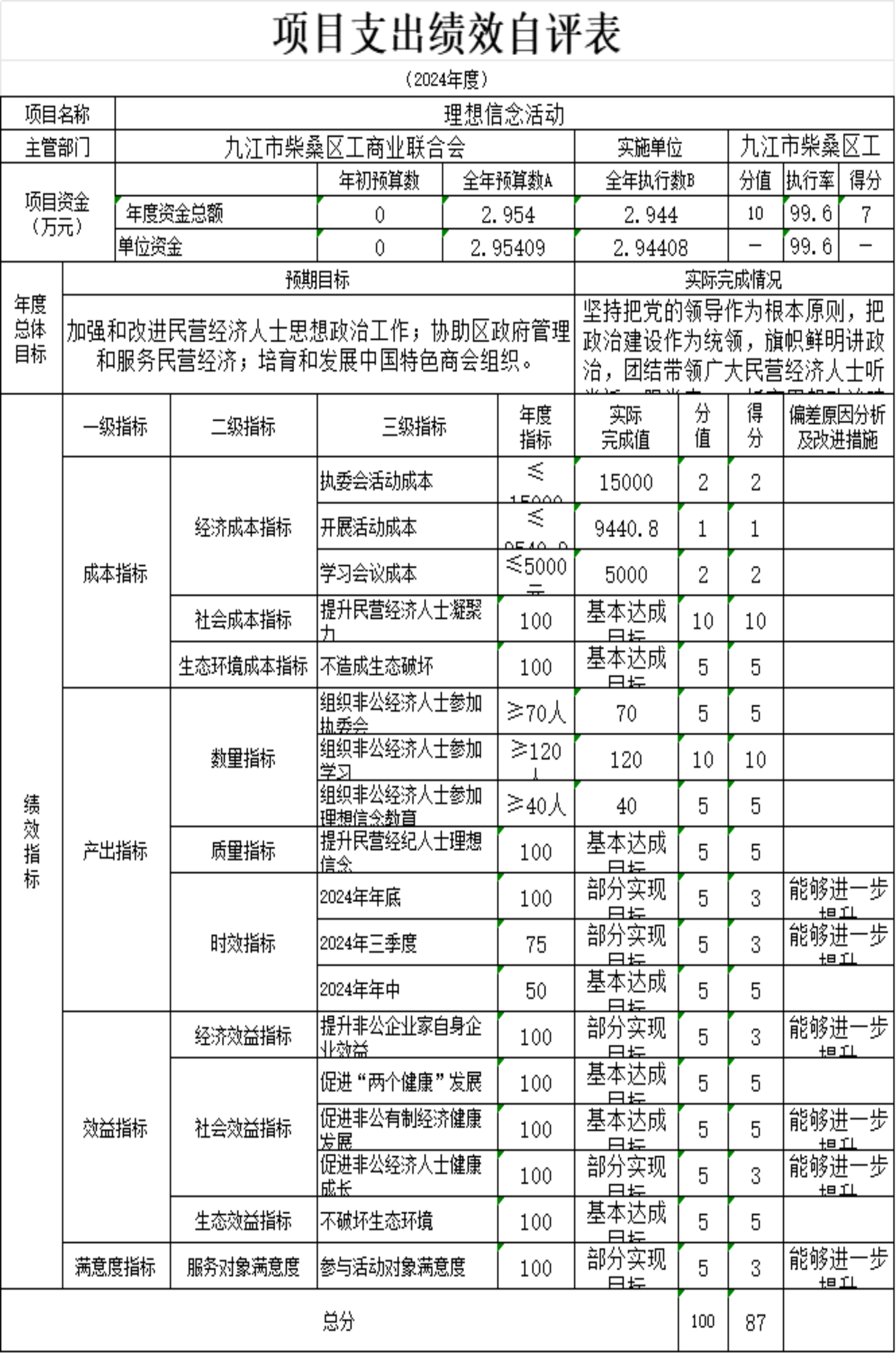 本单位“工商联2023年理想信念教育活动”项目支出绩效自评结果如下: