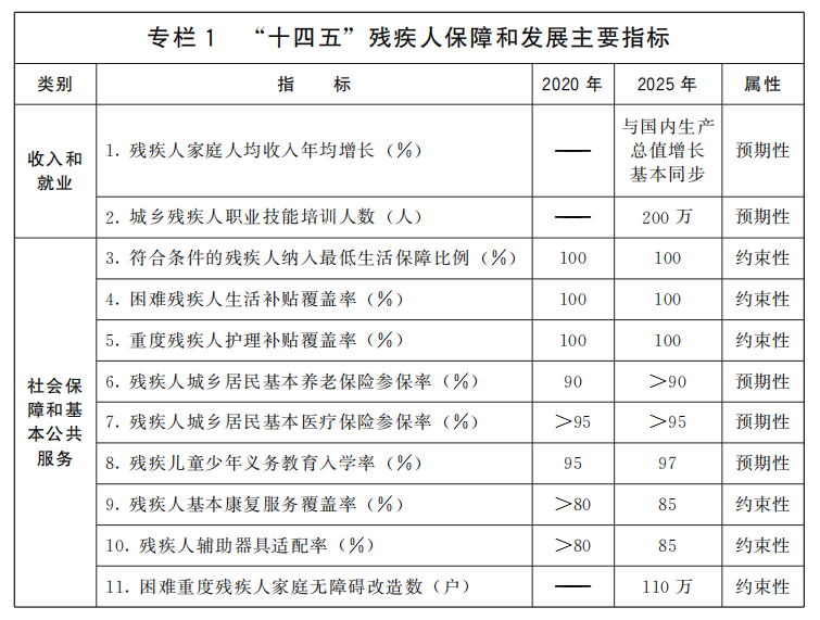 到2025年,残疾人脱贫攻坚成果巩固拓展,生活品质得到新改善,民生福祉达到新水平。多层次的残疾人社会保障制度基本建立,残疾人基本民生得到稳定保障,重度残疾人得到更好照护。多形式的残疾人就业支持体系基本形成,残疾人实现较为充分较高质量的就业。均等化的残疾人基本公共服务体系更加完备,残疾人思想道德素养、科学文化素质和身心健康水平明显提高。无障碍环境持续优化,残疾人在政治、经济、文化、社会、家庭生活等各方面平等权利得到更好实现。残疾人事业基础保障条件明显改善,质量效益不断提升。
