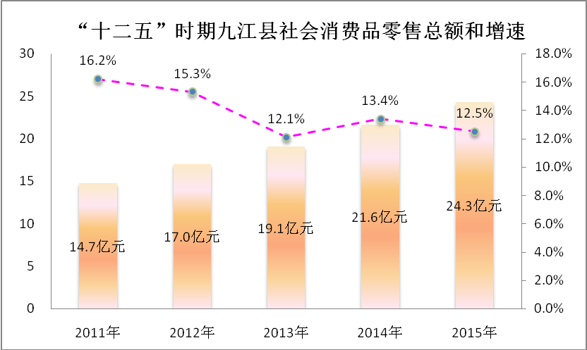结构调整取得新进展。产业结构持续优化,三次产业结构比由16.0:63.6:20.4调整为12.9:57.2:29.9。社会消费品零售总额五年累计完成96.7亿元,年均增长13.8%,消费拉动作用明显增强;现代农业加快发展,“省级现代农业示范区”建设成效显著,新增“三品一标”15个,赤湖大闸蟹荣获全国河蟹大奖赛金奖,赛城湖四大家鱼通过有机食品认证,博莱集团更是跻身国家级龙头企业,实现了国家级农业龙头企业“零”的突破;平台建设引领工业转型升级,赤湖工业园22.5平方公里核心区基本实现“九通一平”,沙城工业园扩征扩容顺利推进,建成区面积达到“十一五”期末的1.5倍,累计实施重大产业项目71个,全县规模以上工业企业由55家增至102家,主营业务收入过亿元以上企业突破至60家,沙城工业园被评为“江西省重点工业园区”;服务业规模与质量逐步提升,九江民生大千世界建成开园,中华贤母园成功创建国家4A级景区,联盛易佳、新长江建材大市场和城西汽车大市场等一批商贸物流项目建成运营,丽都步行街被认定为“江西省特色商业街”,文化旅游、商贸物流和民营经济成为新的经济增长点。