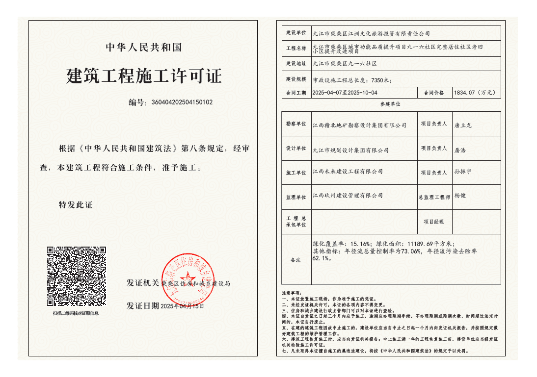核发九江市柴桑区城市功能品质提升项目九一六社区完整居住社区老旧小区提升改造项目建筑工程施工许可证