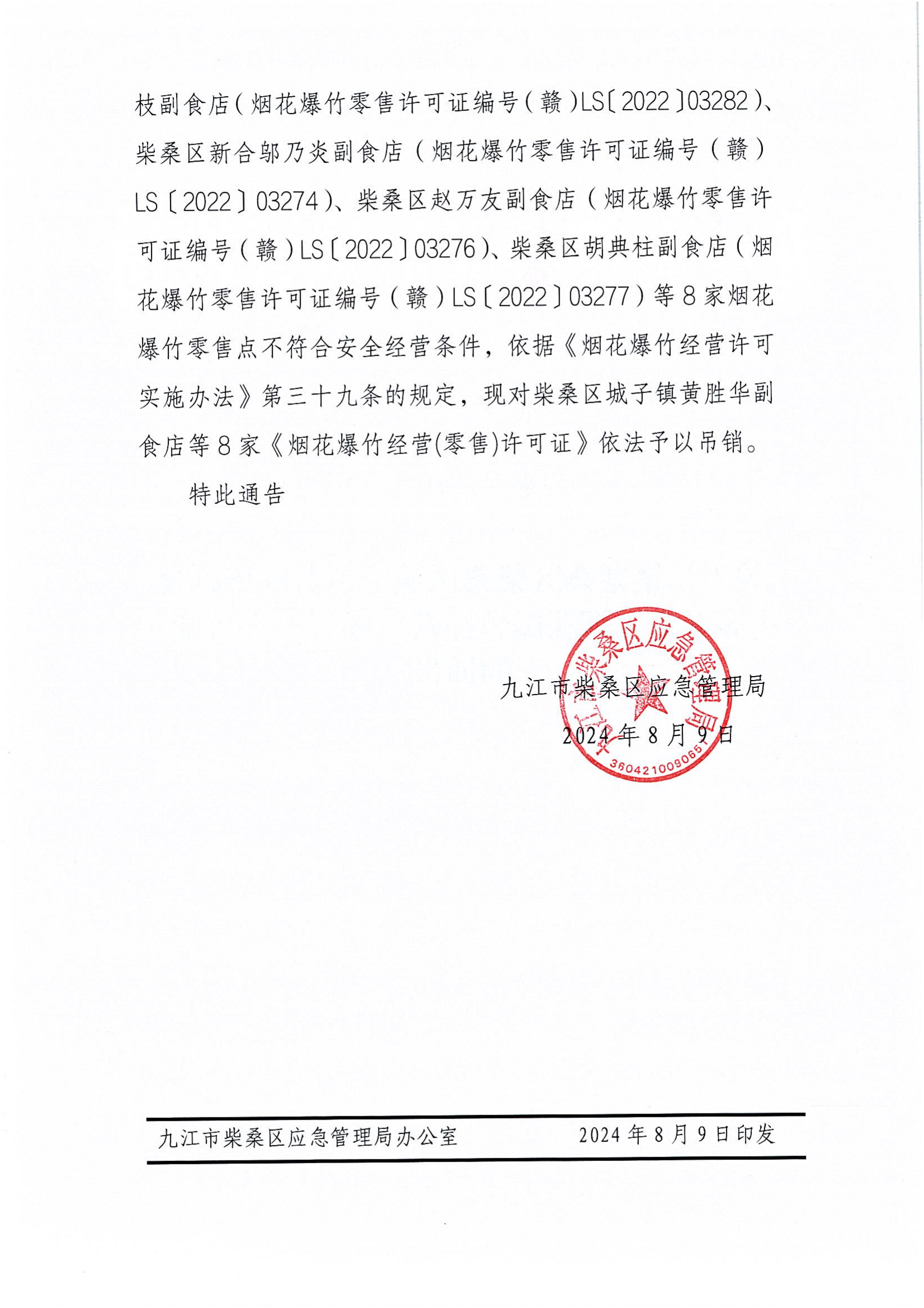 关于吊销柴桑区柴桑区城子镇黄胜华副食店等8家《烟花爆竹经营(零售)许可证》的通告