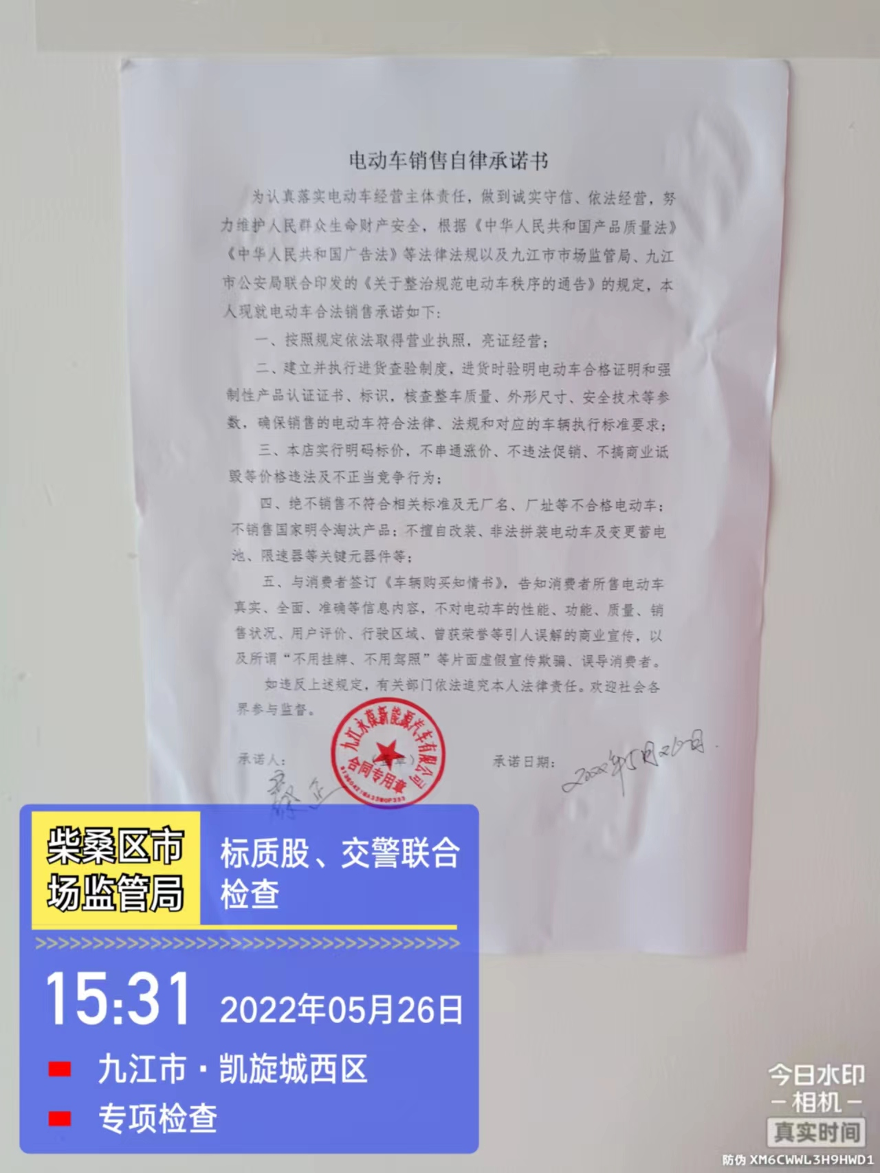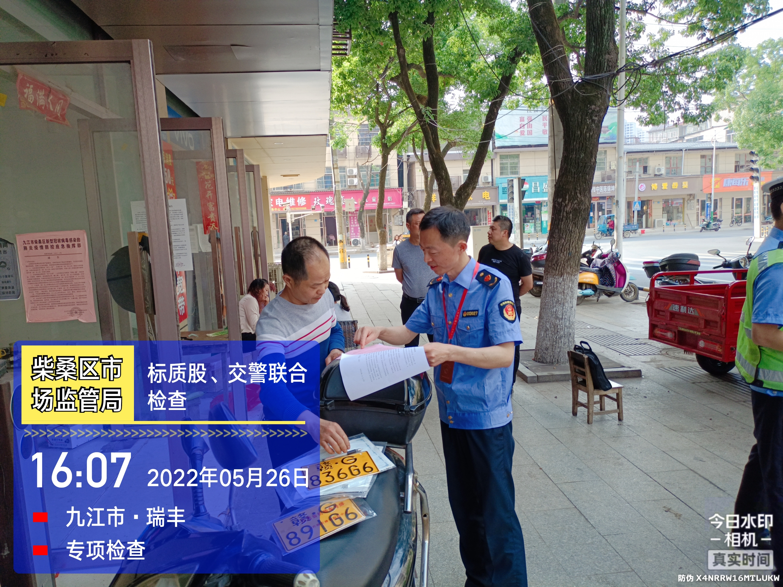为规范我区电动车市场经营秩序,切实维护消费者合法权益,有效预防道路交通事故,依据《九江市城市道路通行管理条例》相关规定和《九江市电动车专项整治工作方案》等文件要求,5月26日下午,柴桑区市监局联合交警部门深入开展电动车销售市场专项整治行动,严厉查处伪造、冒用、买卖认证标志或者认证证书的行为。