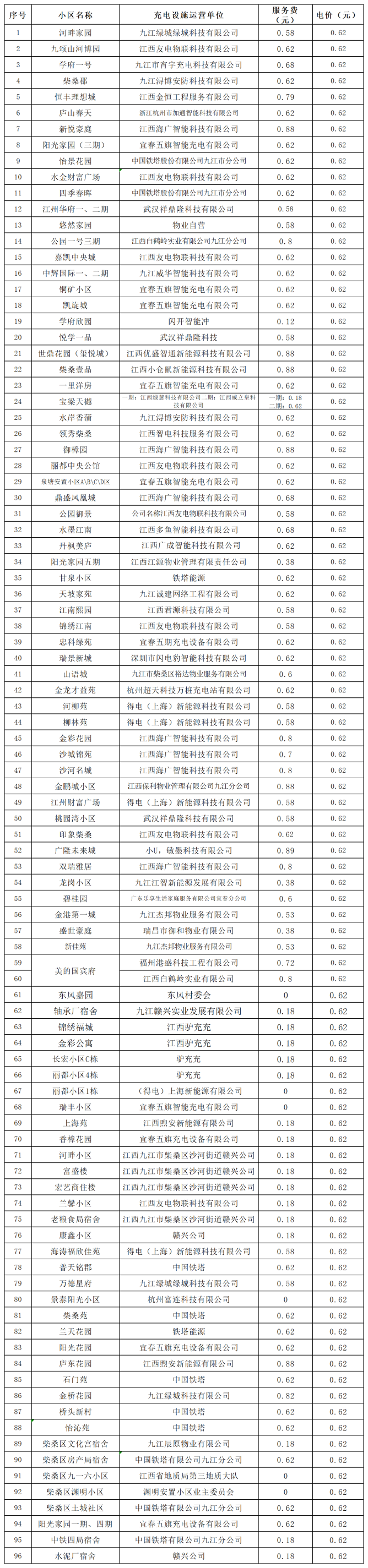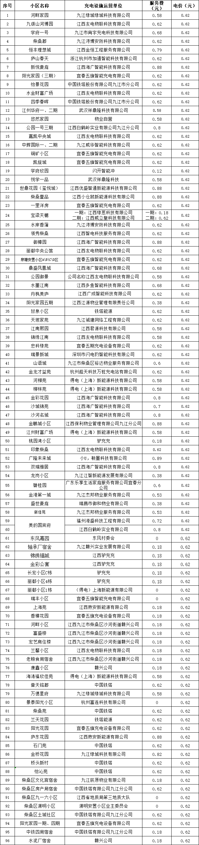 为深入整治电动自行车安全隐患,柴桑区市场监管局严格按照国家发展和改革委员会办公厅、市场监管总局办公厅发布的《关于规范电动自行车充电收费行为的通知》要求,全面加强电动自行车充电价格监督检查,督促充电桩运营企业落实“价格公示”“价费分离”等制度,降低收费标准,规范经营行为。现将河畔家园、九颂山河博园、学府一号等96个小区电动自行车充电收费价格(按充电电量计费)公示如下。