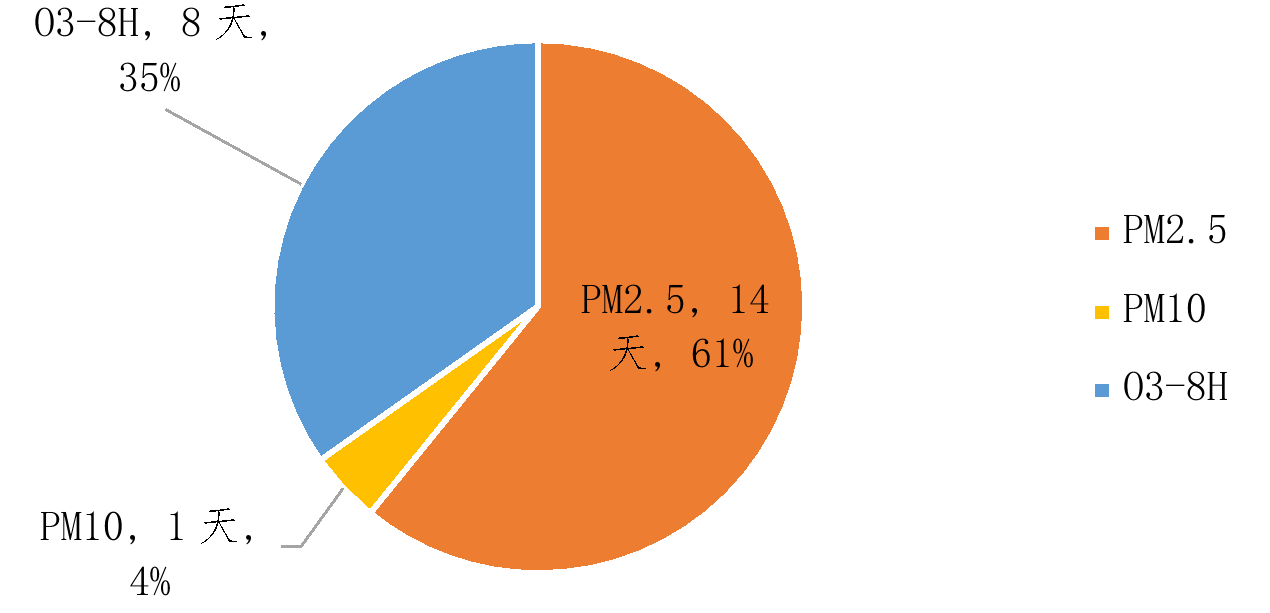 2024年,柴桑区共出现23个污染日。其中,14天以PM2.5为首要污染物,占比为61%;8天以O3-8H为首要污染物,占比为35%;1天以PM10为首要污染物,占比为4%。详见图2。