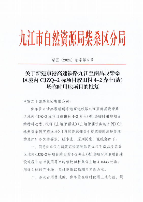 新建京港高速铁路九江至南昌段柴桑区境内CJZQ-2标项目蛟田村4-2弃土(渣)场临时用地的批复
