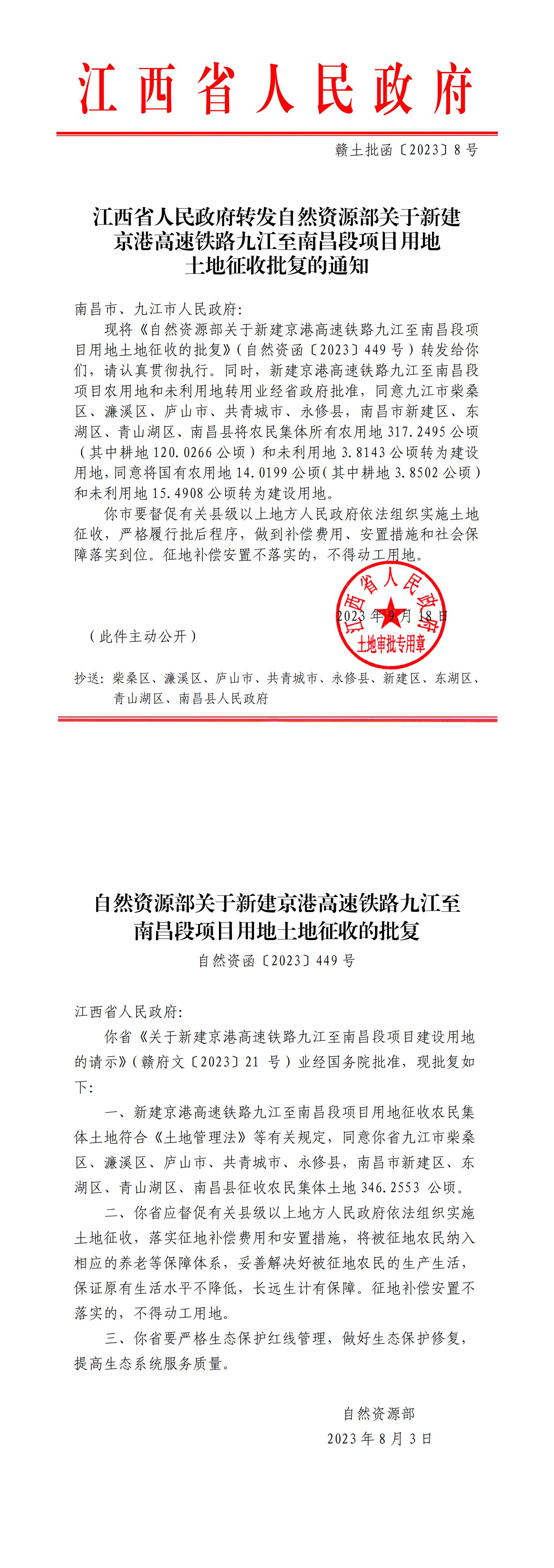【土地征收批复】江西省人民政府转发自然资源部关于新建京港高速铁路九江至南昌段项目用地土地征收批复的通知