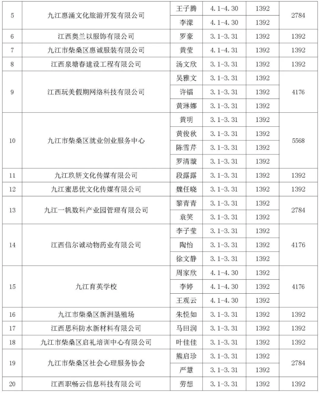 根据江西省人力资源和社会保障厅、江西省教育厅、江西省科学技术厅、江西省工业和信息化厅等十部门关于实施江西省就业见习岗位招募计划的通知赣人社发[2023]9号和赣人社函[2024]29号文件精神,经登记审核,柴桑区2025年4月符合就业见习补贴的企事业单位共计30家,见习人员共计68人,见习岗位补贴标准为1392元每人/月,同意给予就业见习补贴资金共计9.4656万元,拟从就业专项资金中予以列支给相关见习单位。(详见下表)