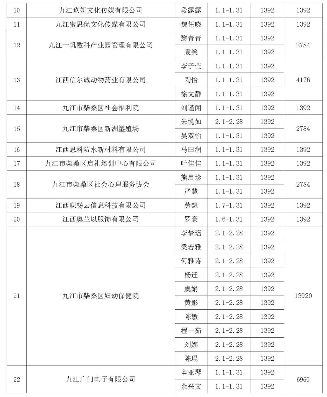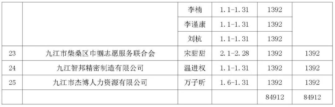 根据江西省人力资源和社会保障厅、江西省教育厅、江西省科学技术厅、江西省工业和信息化厅等十部门关于实施江西省就业见习岗位招募计划的通知赣人社发[2023]9号和赣人社函[2024]29号文件精神,经登记审核,柴桑区2025年1月符合就业见习补贴的企事业单位共计25家,见习人员共计61人,见习岗位补贴标准为1392元每人/月,同意给予就业见习补贴资金共计8.4912万元,拟从就业专项资金中予以列支给相关见习单位。(详见下表)
