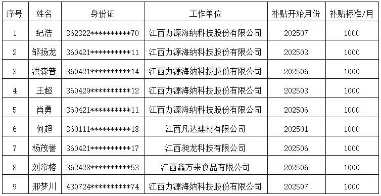 为贯彻落实《江西省人力资源和社会保障厅江西省工业和信息化厅江西省财政厅关于做好高校毕业生基层就业岗位补贴工作的通知》(赣人社字[2025]108号)文件精神,经审核,目前9人符合2025年度毕业2年内高校毕业生基层岗位补贴条件,自补贴开始月份起至离岗每人每月1000元,补贴期限最长不超过12个月。每人只能享受一次,不得跨区域、跨企业重复享受。