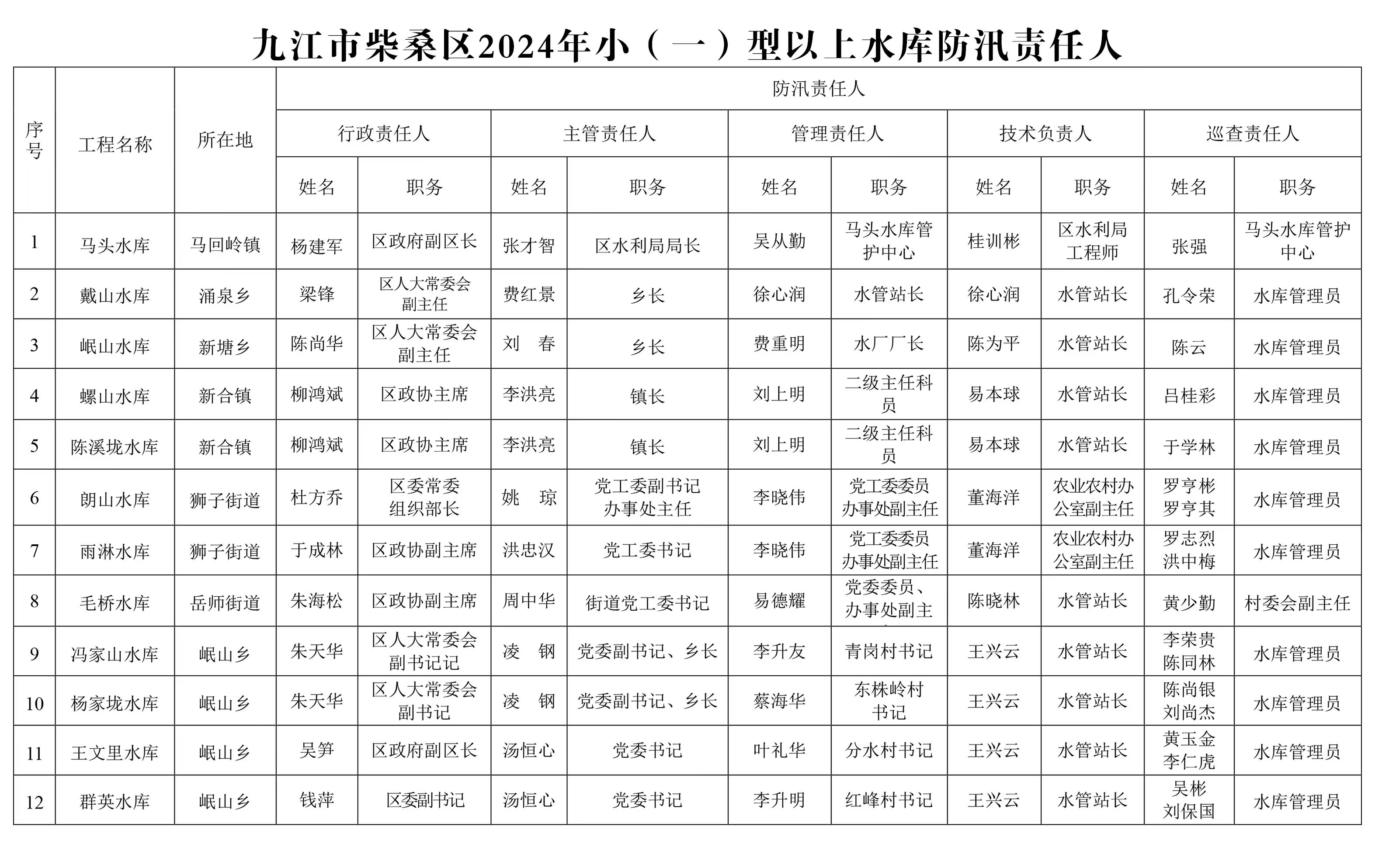 九江柴桑区2024年小(一)型以上水库防汛责任人
