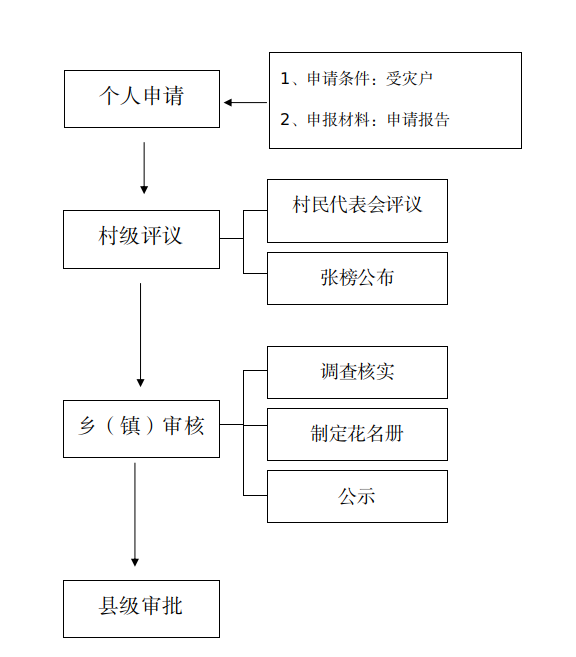 各地应在摸清底数、核实灾情的基础上,严格按照民主评议、登记造册、张榜公布、公开发放的工作规程,通过“户报、村评、乡审、县定”四个步骤确定救助对象: