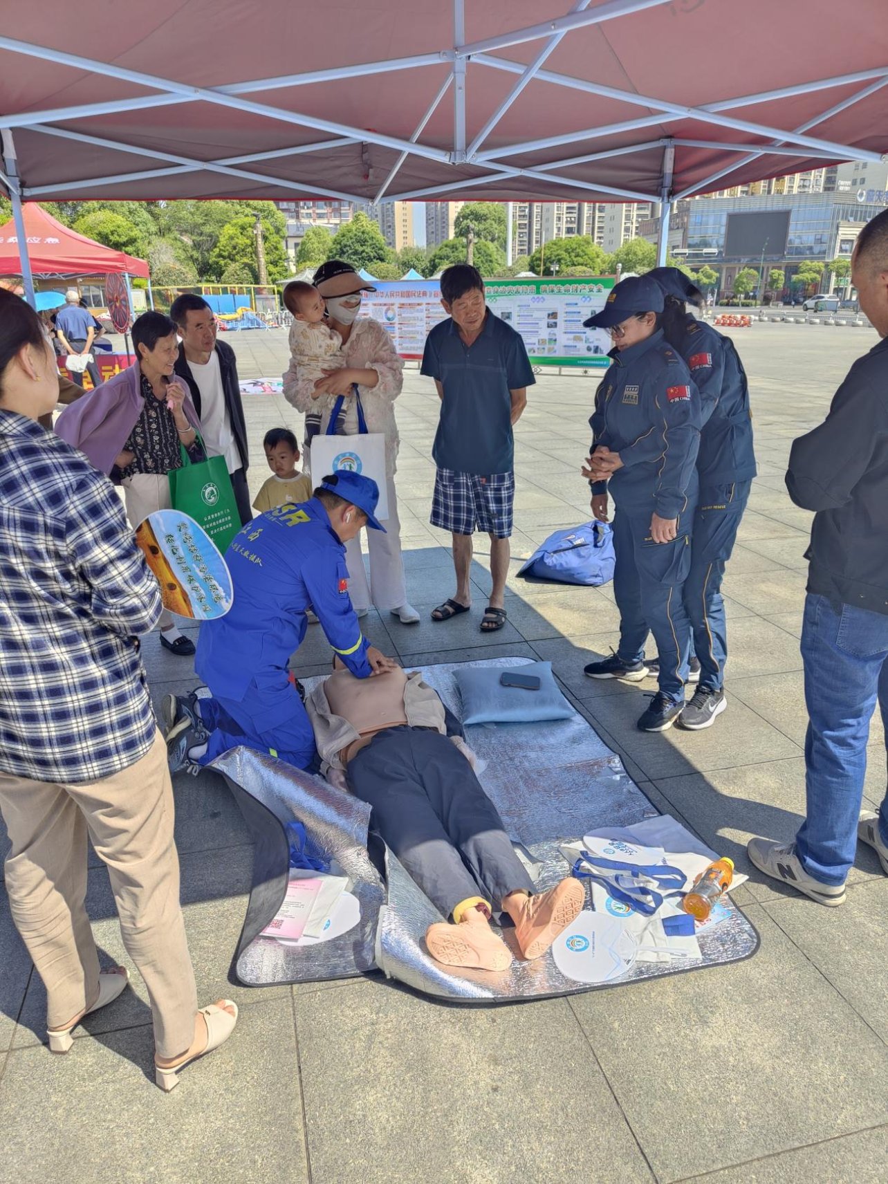 活动现场通过搭建宣传彩虹桥、悬挂宣传横幅、制作宣传展板、发放宣传资料等形式,向群众普及防灾减灾知识。蓝天救援队还以实操演练的方式展示了人工呼吸救治手法和注意事项。现场共发放各类防灾减灾宣传资料1200余份,展出各类宣传展板20余块。群众反响热烈,踊跃咨询日常生活中遇到的各类安全隐患问题。
