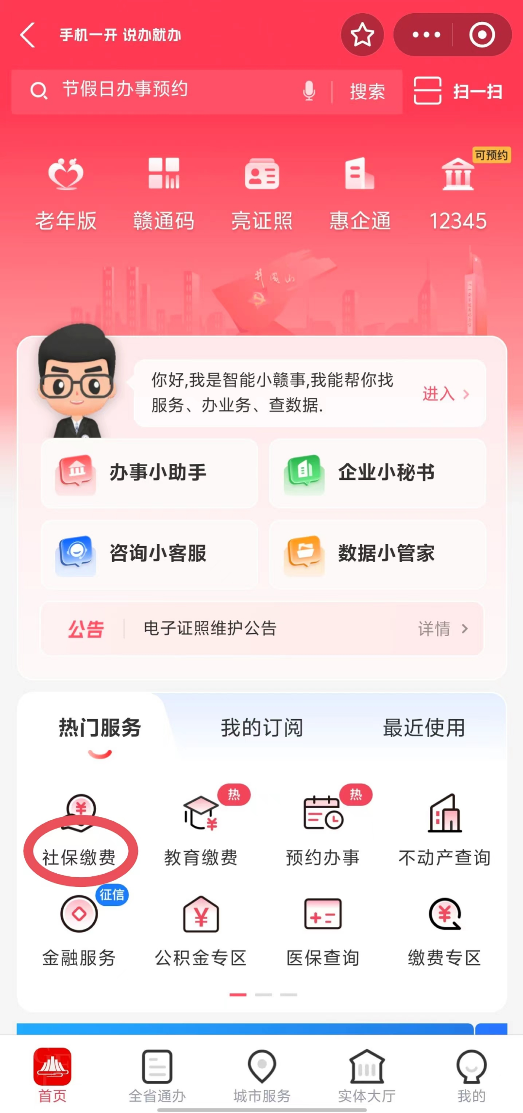 (2)赣服通(支付宝)缴费查询。通过支付宝“赣服通”-“社保缴费”,经人脸识别认证后,选择“我要查询”,即可查询缴费信息。