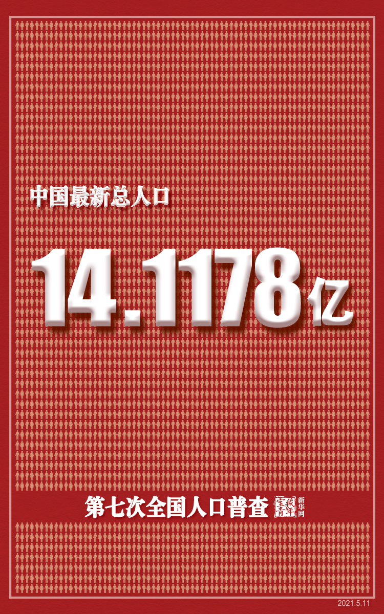 国务院第七次全国人口普查领导小组副组长、国家统计局局长宁吉喆介绍,全国人口共141178万人,与2010年(第六次全国人口普查数据)的133972万人相比,增加7206万人,增长5.38%,年平均增长率为0.53%,比2000年到2010年的年平均增长率0.57%下降0.04个百分点。数据表明,我国人口10年来继续保持低速增长态势。