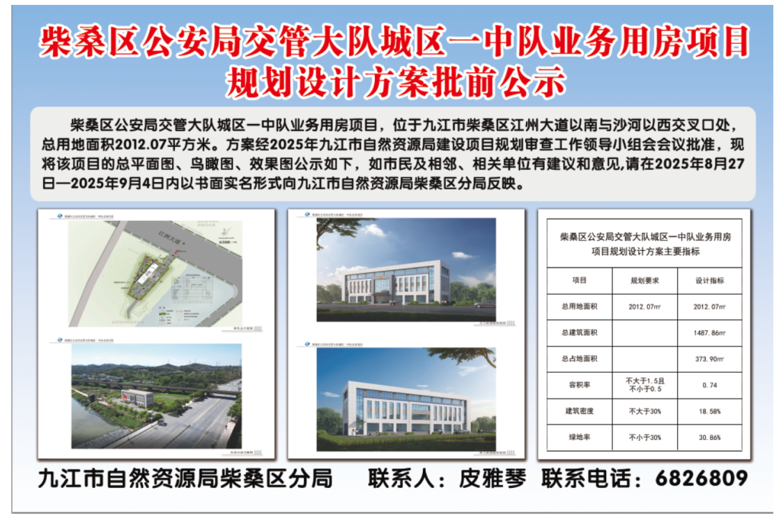 柴桑区公安局交管大队城区一中队业务用房项目规划设计方案批前公示