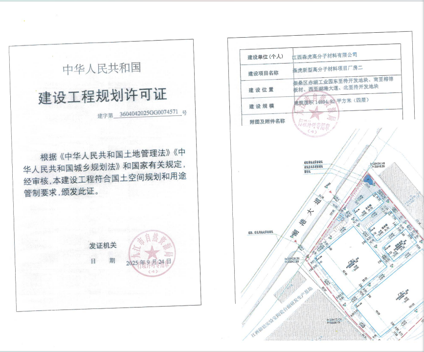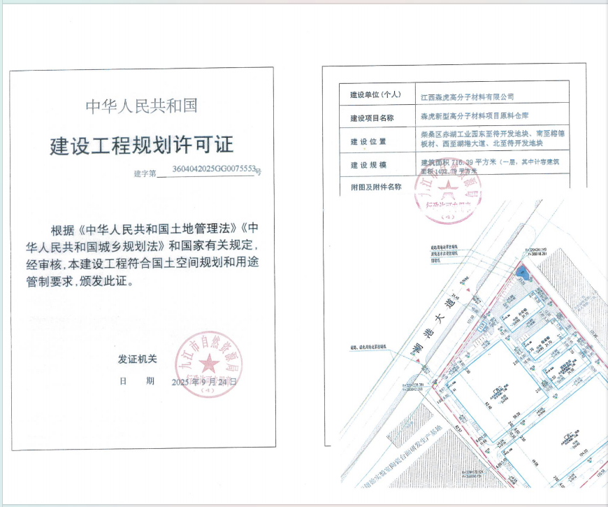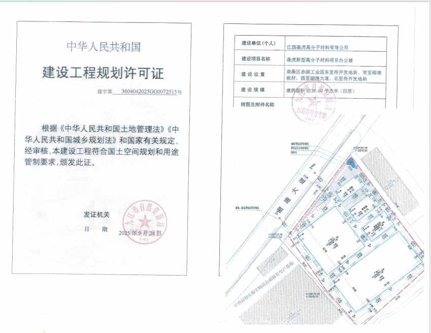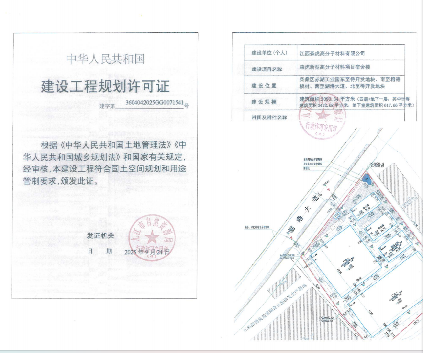 森虎新型高分子材料项目宿舍楼、办公楼、厂房一、厂房二、原料仓库、门卫建设工程规划许可证批准结果公示