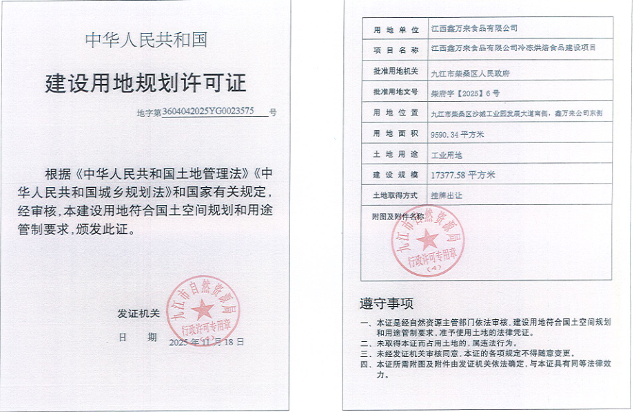 江西鑫万来食品有限公司冷冻烘焙食品建设项目建设用地规划许可证批准结果公示