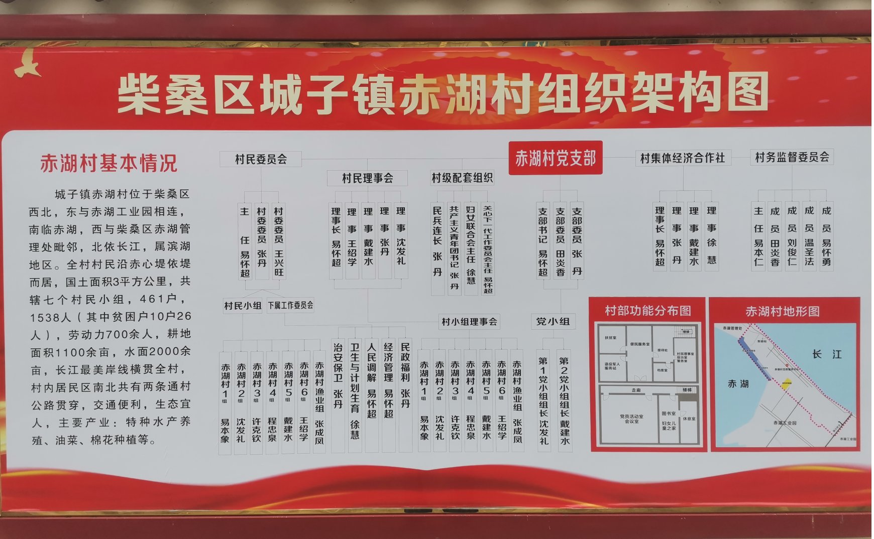 赤湖村位于城子镇东端7公里,是入城子镇的东大门,东与赤湖工业园相连,南邻赤湖,西与赤湖管理处毗邻,北倚长江。辖区内面积约3平方公里,耕地总面积1100亩,水面约2000亩。行政村下辖4个自然村,7个村民小组,农户318户,总人口1538人,低保家庭26户47人,分散五保户一户一人,脱贫户10户26人。