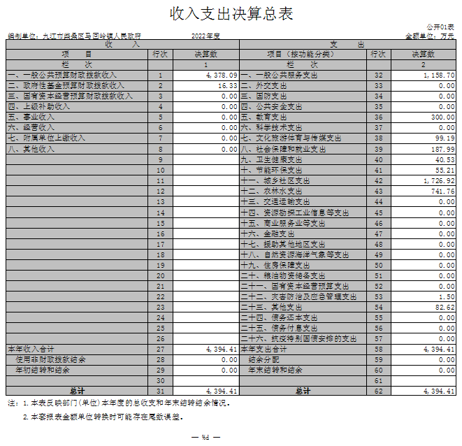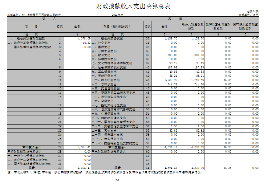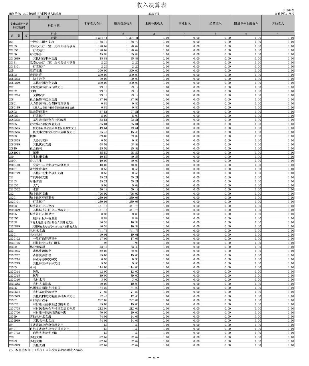 本部门2022年度收入总计4394.41万元,其中年初结转和结余0万元,较2021年减少3077.89万元,下降41.19%;本年收入合计4394.41万元,较2021年减少2260.66万元,下降33.97%,主要原因是:项目支出预算调整幅度偏大,2022年新农村建设、公墓建设项目已完工,资金减少。