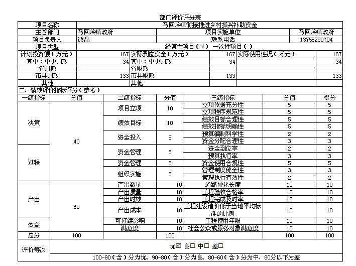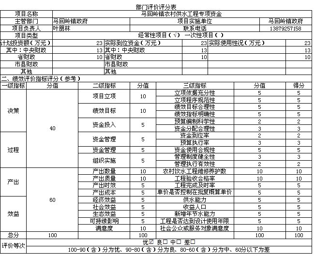 组织对“马回岭镇农业生产救灾资金”、“马回岭镇水利工程专项资金”等9个项目开展了部门评价,涉及一般公共预算支出1791.4万元,政府性基金预算支出0万元,国有资本预算支出0万元。从评价情况来看,目标完成情况较好,各项指标均达标,评价结果均为“优秀”。