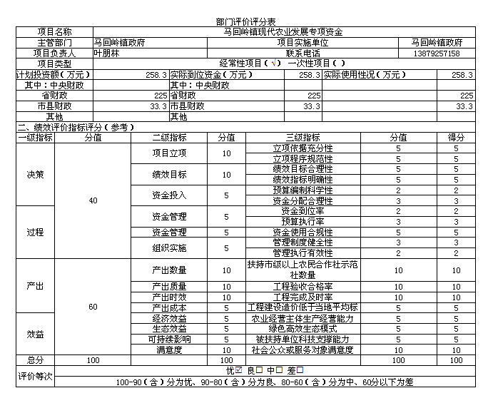 - 全年下达指标金额258.3万元,资金使用率100%,自评100分。