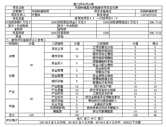 (一)全年下达指标金额1000万元,资金使用率60%,自评96分。