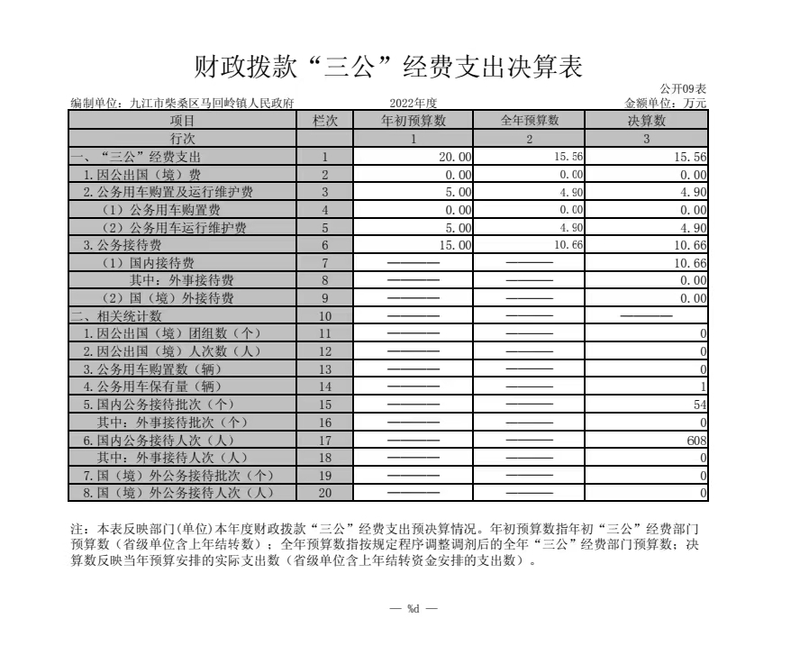 (二)公务接待费支出全年预算数为15万元,决算数为10.66万元,完成全年预算的71.1%,决算数较2021年增加5.75万元,增长117.1%,主要原因是其他单位来马回岭考察、调研、检查及加大招商力度。决算数较全年预算数减少的主要原因是:严格执行中央八项规定,压缩公务接待开支。全年国内公务接待 54批,累计接待608人次,其中外事接待0批,累计接待0人次,主要为考察调研、招商接待。