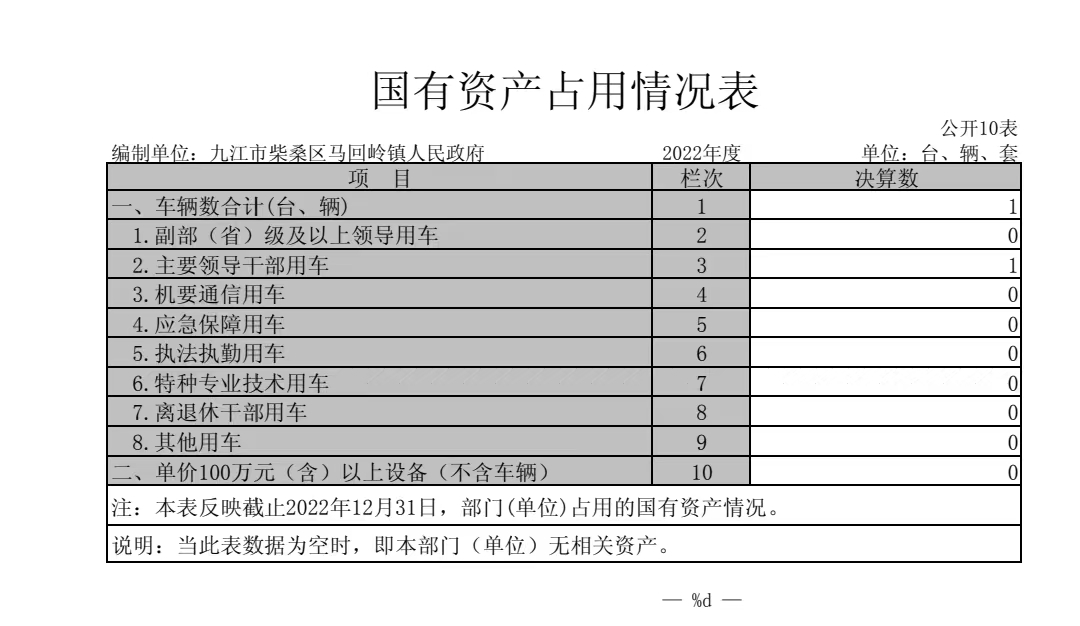 截止2022年12月31日,本部门国有资产占用情况见公开10表《国有资产占用情况表》,其中公务车辆1台,其他用车0台。