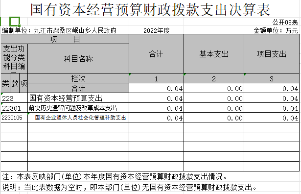 (九)国有资本经营预算支出年初预算数为0万元,决算数为0.04万元,完成年初预算的100%,主要原因是:追加国有企业退休人员社会化管理补助预算。