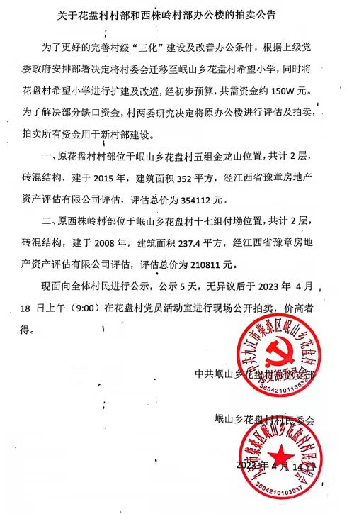 关于花盘村村部和西株岭村部办公楼的拍卖公告