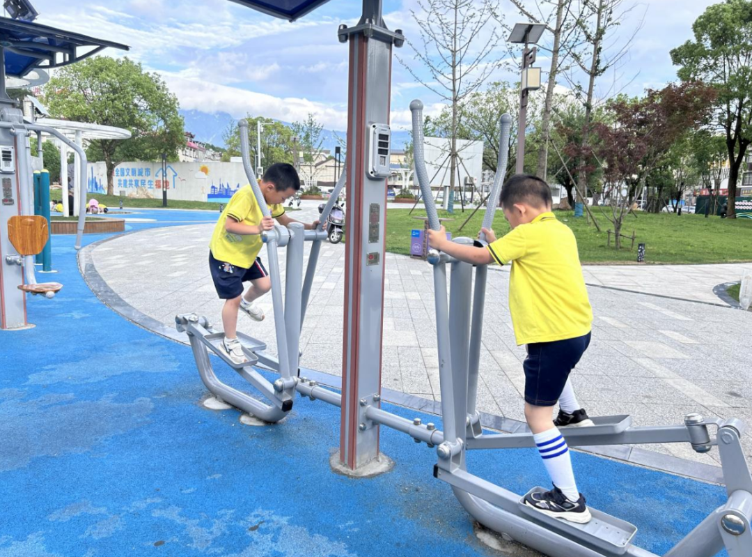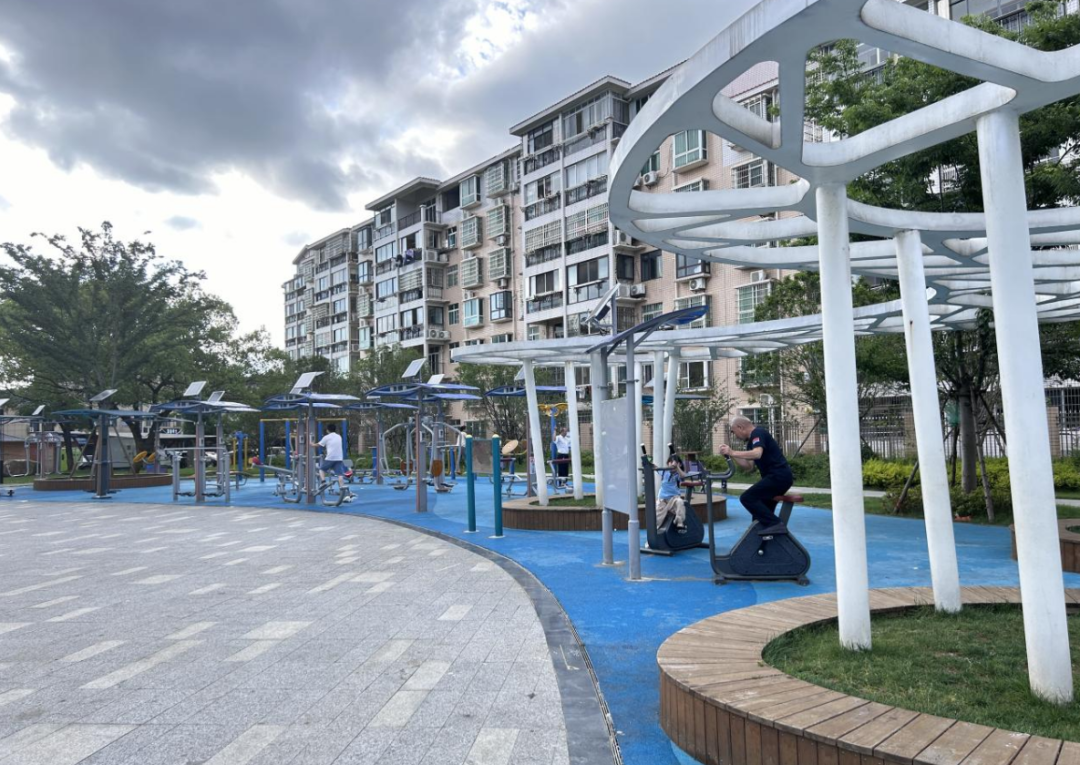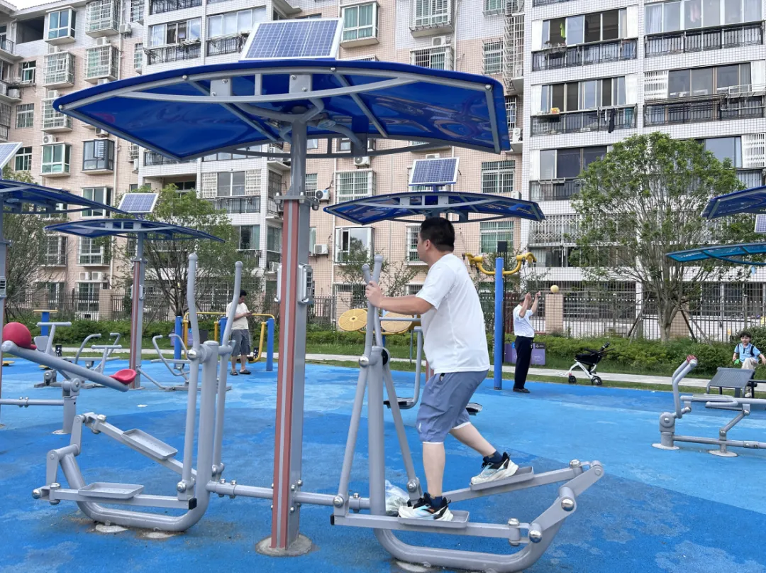 值得一提的是,这些智能健身器材还配备了太阳能发电板和蓝色遮阳棚,确保设备在全天候都能为居民提供服务。同时,增加的照明灯也确保了夜间锻炼的安全性和便利性。