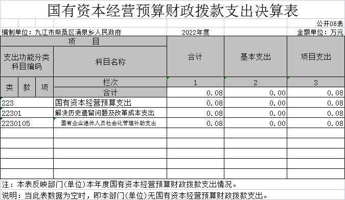 (九)国有资本经营预算支出年初预算数为0万元,决算数为0.08万元,完成年初预算数的100%,主要原因是:政府预算调整到本单位国有资本经营支出。