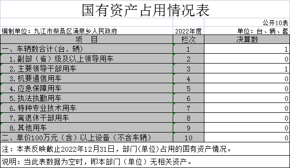 截至2022年12月31日,本部门国有资产占用情况见公开10表《国有资产占用情况表》。本部门共有1辆车,其中公务用车1辆,其他用车0辆。