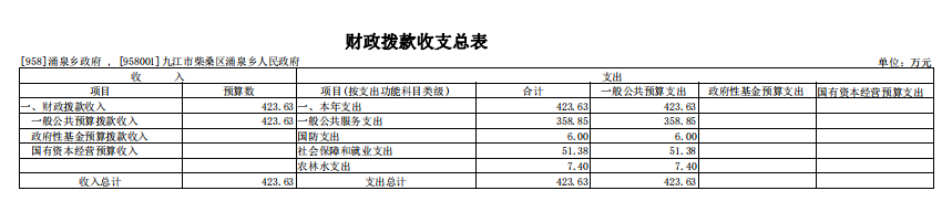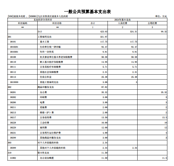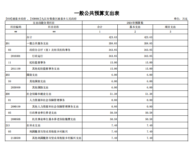 2024年涌泉乡人民政府财政拨款支出预算总额为423.63万元,较上年预算安排减少215.12万元;