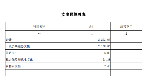 按支出功能科目划分:一般公共服务支出2185.85万元,较上年预算安排增加1634.07万元;国防支出6万元,较上年预算安排不变;社会保障和就业支出51.38万元,较上年预算安排减少1.19万元;节能环保支出0万元,较上年预算安排减少21万元;农林水支出7.4万元,较上年预算安排不变。