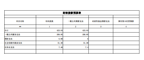 按支出功能科目划分:一般公共服务支出358.85万元,国防支出6万元,社会保障和就业支出51.38万元,农林水支出7.4万元。