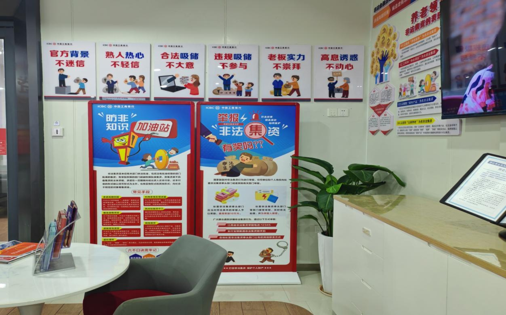 服务站内的防非主题墙构建起全方位知识矩阵,让防非服务自然融入群众日常生活。一是在墙上设置防范非法集资内容知识板块,例如三大常见手段、养老领域非法集资表现形式、非法集资歌谣等,以图文结合的方式,更直观的让群众了解到非法集资的危害和防范方法,降低了学习门槛,让知识真正潜移默化的深入人心;二是通过防非视频区的电视屏幕滚动播放案例警示片,以网点大厅微沙龙的形式让群众在办理银行业务的闲暇时间之余既能打发时间,也可以增强自己的金融知识,同时服务台还摆放着防非宣传折页,群众可随时翻阅,将金融安全知识“带回家”;三是以卡通人物场景化呈现,把晦涩的金融风险点转化为通俗易懂的行动指南,同时通过立式展架明确举报奖励机制,从“防范”到“举报”形成完整闭环。