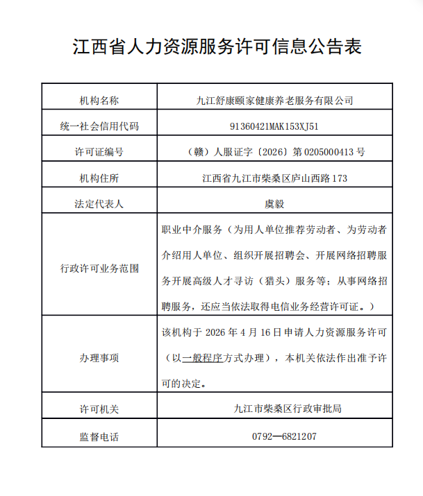 根据《中华人民共和国就业促进法》《人力资源市场暂行条例》(国务院令第700号)、《江西省人力资源市场条例》和《江西省人力资源服务事项办理手册(试行)》有关规定,以及《劳动合同法》、《劳务派遣行政许可实施办法》的规定和《江西省人力资源和社会保障厅关于做好劳务派遣有关工作的通知》(赣人社字[2014]148号)文件要求。本单位对九江舒康颐家健康养老服务有限公司人力资源服务许可设立申请;九江江洲人力资源管理有限公司劳务派遣经营许可证变更法人申请材料进行审查。认为符合相关规定,准予其许可决定。现将相关情况予以公告。