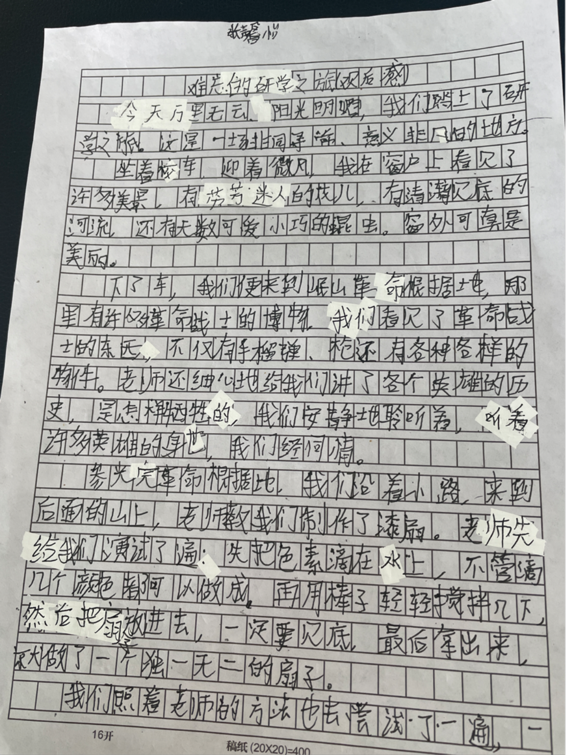 回到家,同学们回忆起难忘的点点滴滴,他们将这些难忘的回忆化作笔尖流淌的文字,他们写道:“这次研学之旅意义非凡,让我们又成长了一分!”“这次难忘的旅行,像一颗种子,在我的心里生根发芽……”