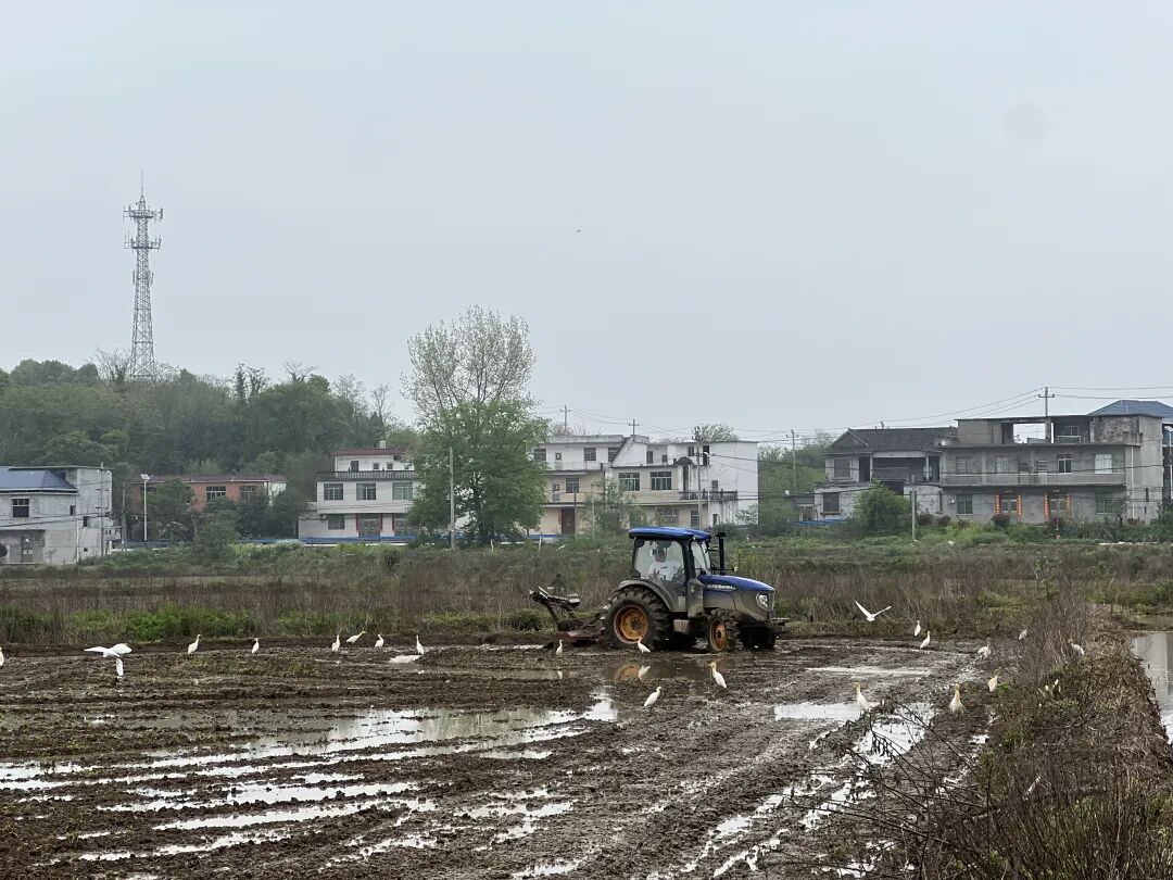 不远处,成群白鹭翩跹而至,或低徊盘旋,或驻足田边,悠然觅食。机器的轰鸣与白鹭的身影相映成趣,构成一幅人与自然和谐共生的春耕图景。