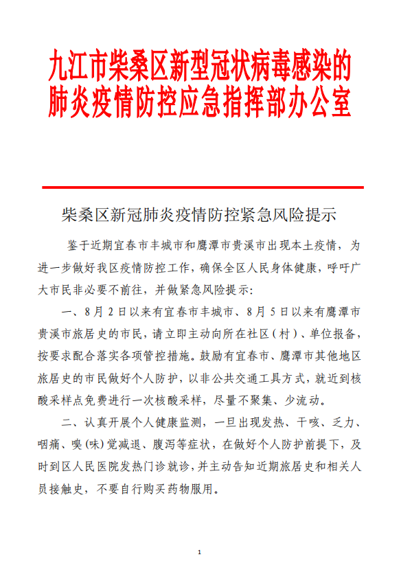 柴桑区新冠肺炎疫情防控紧急风险提示