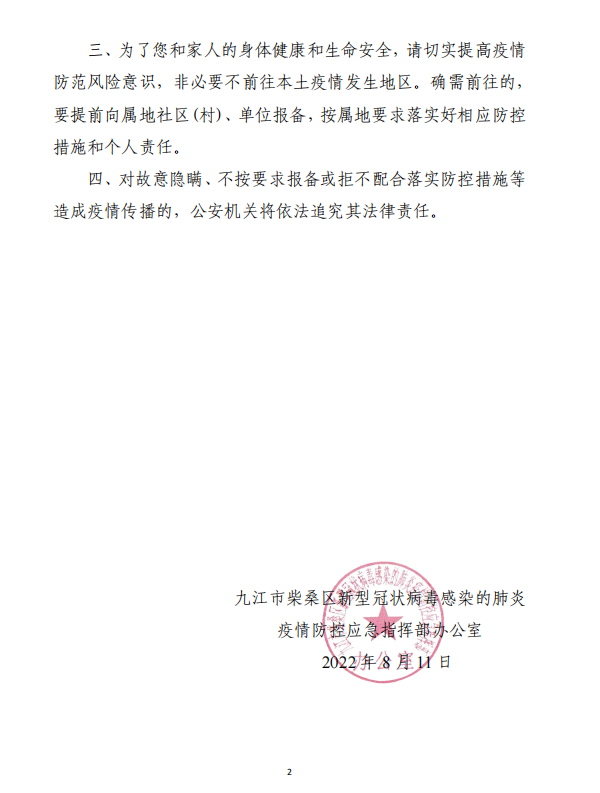 三、为了您和家人的身体健康和生命安全,请切实提高疫情防范风险意识,非必要不前往本土疫情发生地区。确需前往的,要提前向属地社区(村)、单位报备,按属地要求落实好相应防控措施和个人责任。