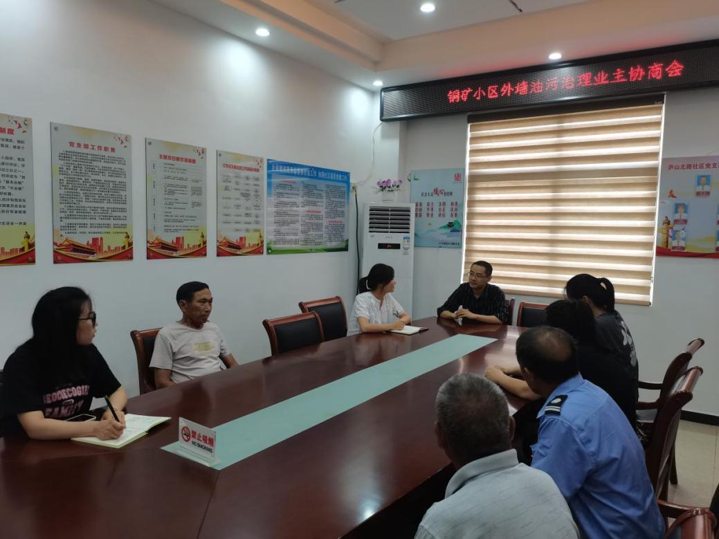 为了进一步推进全国文明城市创建工作,巩固国家卫生城市的工作成果,积极营造良好的居住环境,8月21日,庐北社区党支部在党群服务中心会议室召开了名为“铜矿小区外墙油污治理”的民协商会,与居民们一起商讨长久以来困扰的油污问题。