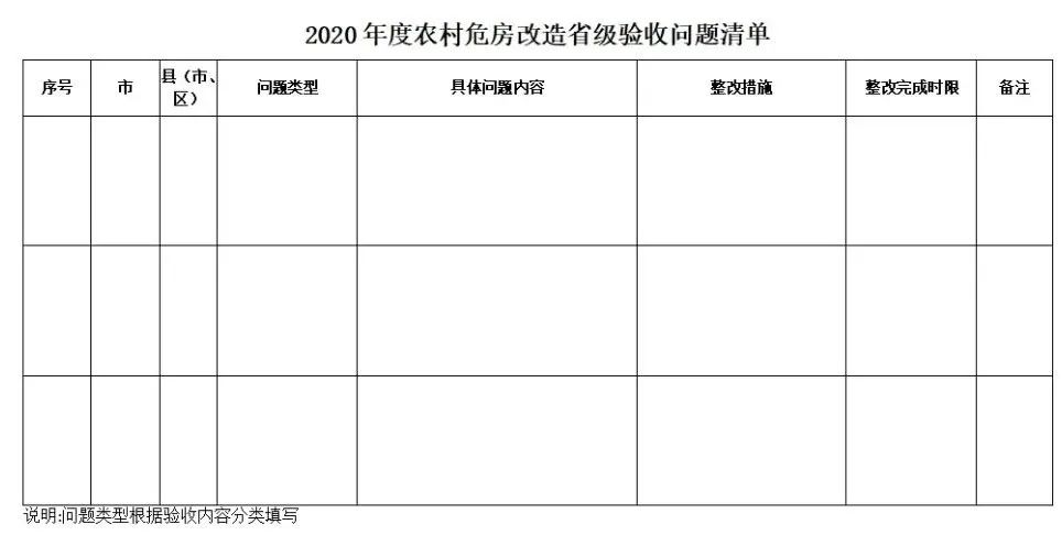 11个设区市、104个下达了2020年农村危房改造任务、灾后重建任务、获取中央、省补助资金的县(市、区)。(一)验收方式以县级自查为主,省、设区市重点抽查为辅的方式进行。县(市、区)对照2020农村危房改造任务逐户逐项全面开展普查验收,对无改造任务的县(市、区)重点检查验收资金使用管理情况,信息录入、核验情况,问题整改及动态监测长效管理情况。设区市抽查建档立卡户、低保户、分散供养特困人员、贫困残疾人家庭、灾后重建和“交钥匙”工程。设区市抽查所辖县(市、区)个数,按吉安市、九江市、上饶市、宜春市、抚州市不少于2个、赣州市不少于3个、其他设区市不少于1个,每个县(市、区)不少于2个乡镇、每个乡镇不少于20户进行,户数不足全数检查。省将对市、县验收工作开展情况进行核验,核验采取现场查看和核查资料相结合的方式进行,重点核查资料录入、资金使用和问题整改情况。(二)按照时间要求完成验收内容、报送验收成果。3月15日前,各设区市汇总经审核的所辖县(市、区)《中央对地方专项转移支付区域(项目)绩效目标自评表》,形成市级《中央对地方专项转移支付区域(项目)绩效目标自评表》,报送省农房办。3月30日前,县级完成自查,形成自查报告,连同问题清单报送所在设区市;4月10日前,设区市完成抽查,汇总所辖县(市、区)验收情况、问题清单,形成验收报告,连同县级自查验收情况报送省农房办。省农房办根据各地上报的自查、抽查情况及信息系统数据进行核验。围绕农村危房改造任务落实、政策执行、信息录入、灾后重建、资金使用管理和住房安全有保障核验工作等情况,结合日常工作调度以及巡视整改、成效考核和暗访通报整改等情况进行验收和评价。1.补助对象认定情况。比对花名册、标识牌、户口本和身份证、“一卡通”,核定是否属于农村危房改造补助对象;查阅村民会议记录和《江西省农村危房改造申请审批表》,检查补助对象的确定是否履行了农户申请、村评议、两级公示、乡镇审核、县级审批程序。2.危房改造面积情况。实地查看:农户自建房屋是否符合“建筑层数控制在一层,建筑面积最大不超过110平方米。原址重建中原宅基地面积较小、不足60平方米的,可建两层,但建筑面积最大不超过110平方米;维修加固房屋是否以维修加固名义搞翻建、扩建、加层建设。严格按照《关于严控农村危房改造新建房屋面积的通知》(赣农房办字〔2019〕5号)文件要求验收。3.基础设施情况。检查水电是否入户,路是否平整,排水是否通畅,门前屋后是否整洁,垃圾是否有统一设施堆放等。4.工程建设情况。一是核查新建房屋主体是否完工、门窗及水电全部安装到位,达到入住条件要求,并核查是否通过县级工程验收并填写《农村危房改造最低建设要求验收表》。二是检查农户改造住房是否符合国家建设部门颁布的质量标准,是否存在质量问题,是否进行过质量安全检查,并填写《农村危房改造建房质量检查表》。三是属于购置房屋的,要查看房屋所有权的变更手续和所购置房屋的质量安全鉴定报告。四是检查抗震改造房屋是否符合抗震要求。5.资金拨付到户情况。查看农户“一卡通”账户,检查补助资金是否已及时全额拨付到户。6.拆旧还基情况。检查D级危房是否全部拆除,异地建房户的旧房宅基地是否交回。7.“交钥匙工程”。县(市、区)是否出台“交钥匙工程”实施对象的认定细则,核查补助对象是否按照相关细则认定,是否符合自筹资金和劳动能力极弱的特困农户定义;建房面积是否严格执行《关于严控农村危房改造新建房屋面积的通知》(赣农房办字〔2019〕5号),“1-2人户不超过40平方米,3人户不超过50平方米,3人以上户不超过60平方米”要求;是否合理安排功能分区和室内空间布局,是否墙面地面整洁、水电到位,可直接入住等要求;是否使用财政补助资金购买家具、家电设施;是否入住。 (二)危房改造档案资料。年度危房改造补助对象(包括民政部门实施的农村危房改造任务)档案是否做到一户一档,存档资料是否齐全。对所有已脱贫对象的居住情况进行详细复核,并做好记录备案。(三)信息录入情况。登录农村危房改造农户档案信息系统,查看相关项目核验评价:1.核验信息录入完整性。一是对照2020年省下达计划任务数,检查农户危房改造信息是否全部录入至“已竣工”。二是查看农户信息是否超量录入、是否存在冗余。2.核验信息录入数据的准确性。结合现场抽查,对照农户纸质档案,核验信息录入真实性。3.核验2020年度C级危房是否全部修缮。从信息系统中,通过农户查询功能调取C级危房档案,是否存在非维修加固方式改造。4.检查建档立卡贫困户住房有保障核验系统录入准确性。使用脱贫攻坚住房安全有保障核验APP,现场对照检查各项录入指标是否准确。(四)核查问题整改情况。核查以下问题清单的问题是否整改到位,并长期坚持。1.中央脱贫攻坚专项巡视和国家扶贫年度成效考核反馈问题的整改台账和销号清单等。2.《关于2019年度全省农村危房改造任务省级验收情况的通报》(赣建村〔2020〕21号)文件和验收问题清单。3.全省农村危房改造技术下乡服务便民行动发现的问题。4.2020年省级脱贫攻坚暗访督导问题台账中涉及受检县的问题清单。(一)规范验收报告。各地依据检查情况形成验收报告及问题清