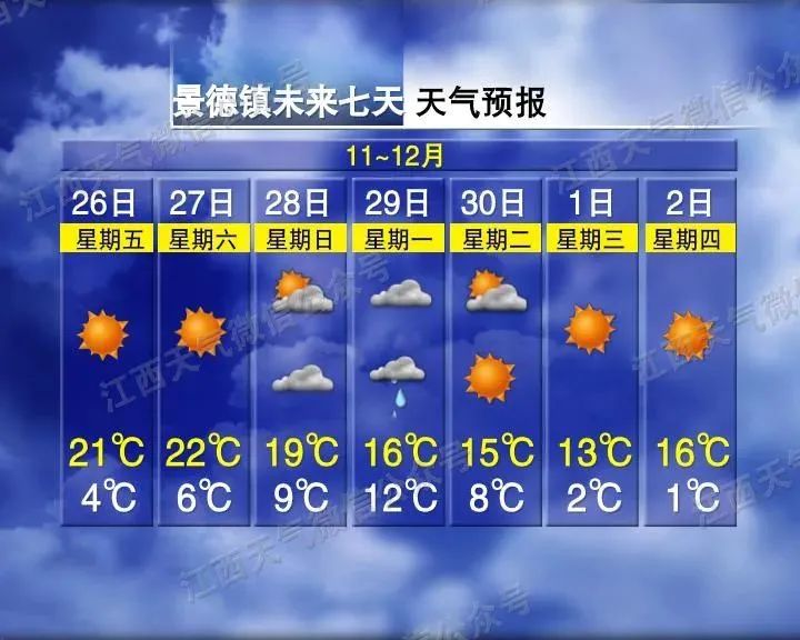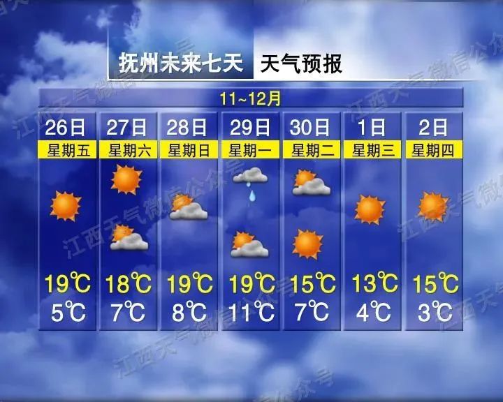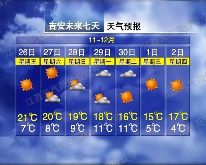 明天白天全省晴天到多云;明天晚上赣西北多云间阴,局部有小雨;全省其他地区多云。
