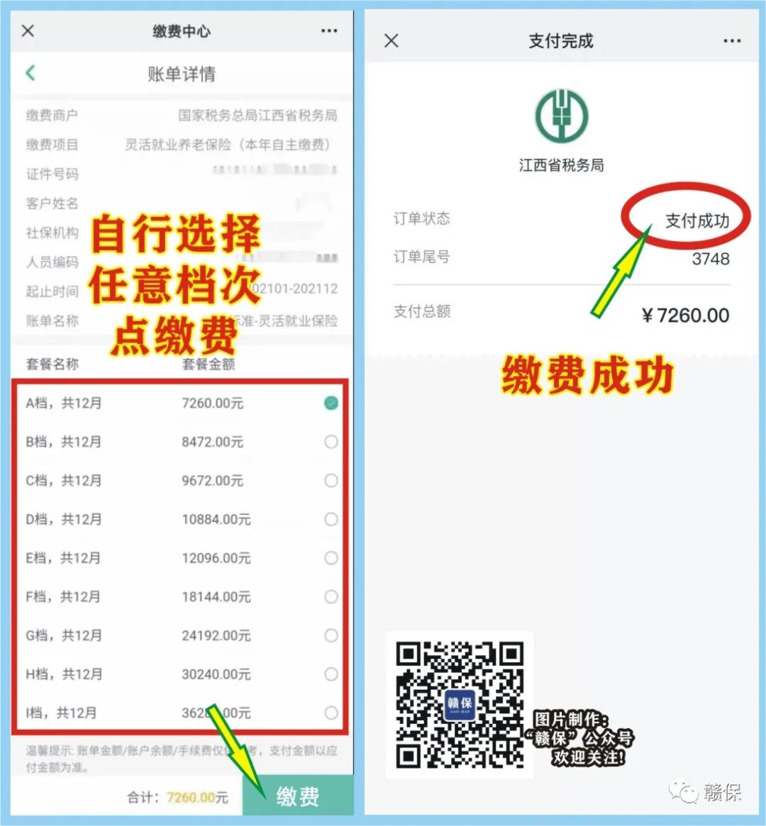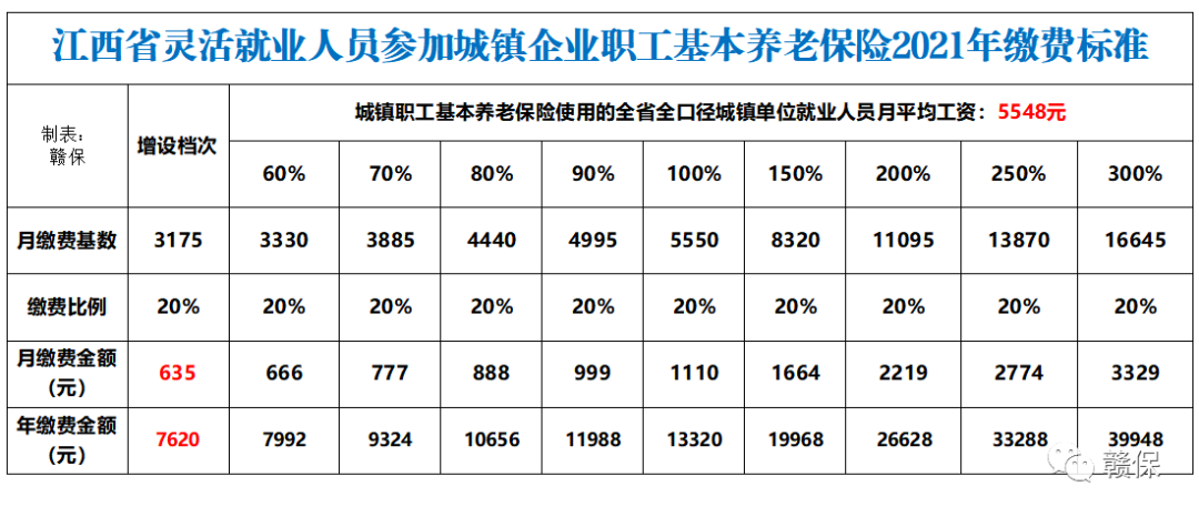 即:最低缴费档次为7620元/年,相比通知公布前的7260元多了360元。关于为什么之前交7260现在交7620,以及多交360元是否划算的问题,请参看之前的文章《重磅!江西灵活就业人员2021年养老保险缴费涨至7620元/年,附详细政策解读》,这里不再赘述。